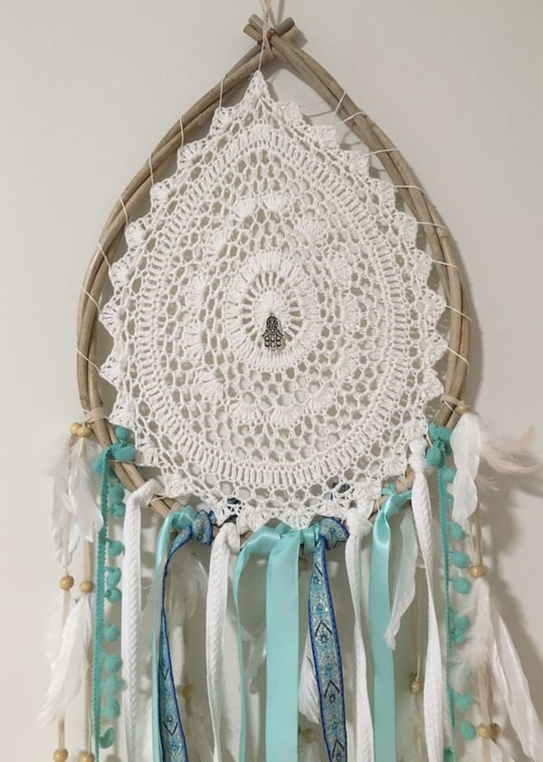 - The hamsa hand is thought to ward off the jealous evil eye, as well as bring the wearer health, good luck and fortune. What a perfect symbol to use in a beautifully crafted crochet dreamcatcher; sure to catch your bad dreams and ward of the evil eye all at once! Handmade with natural wool and wood cane. Size: 28″h x 12.5″w.